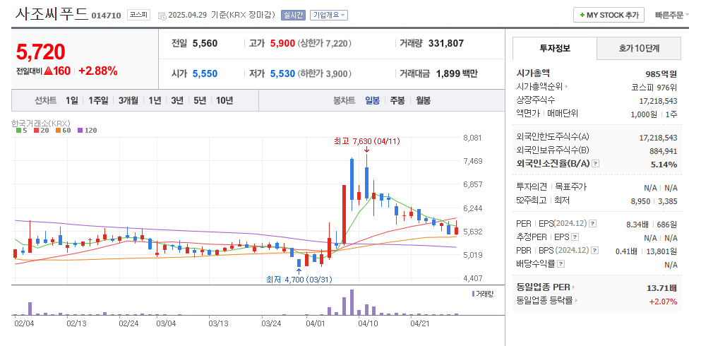 - 사조씨푸드 계열사로, 식품정책 관련 기대감과 함께 정치테마주로 자주 거론