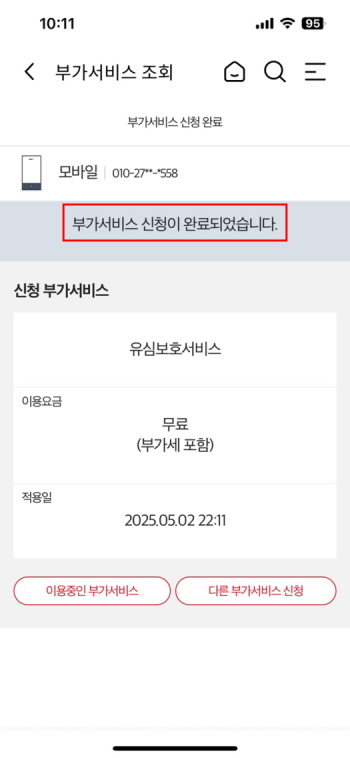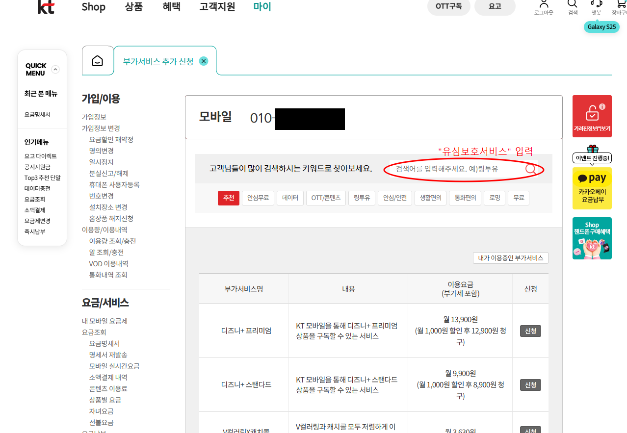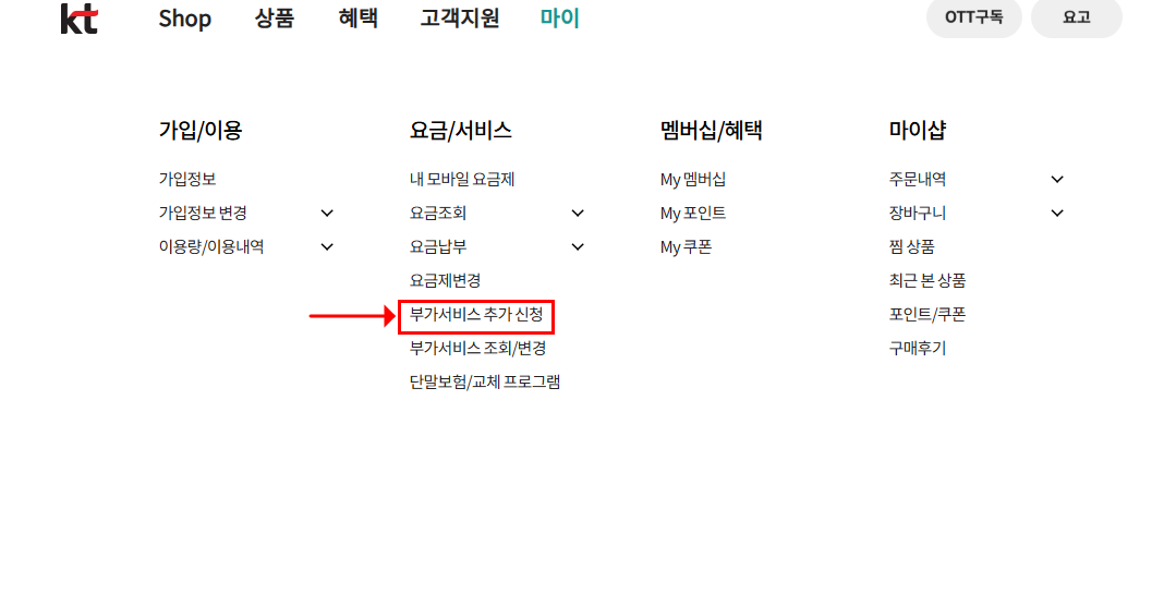 - 로그인 후 메뉴 → 요금/서비스 → 부가서비스 추가 신청으로 이동